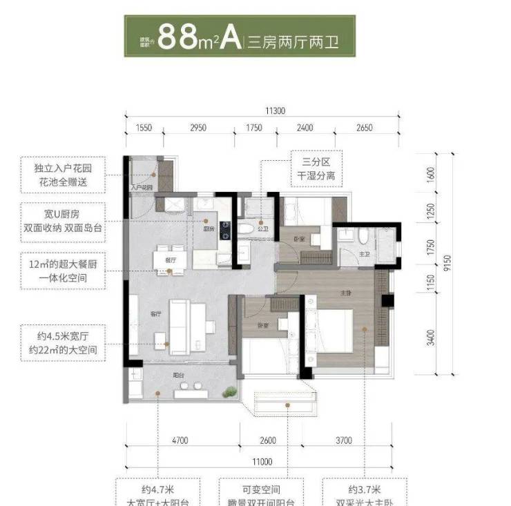 88㎡户型:7米超长阳台+12㎡餐厨一体化,满足家庭欢聚场景