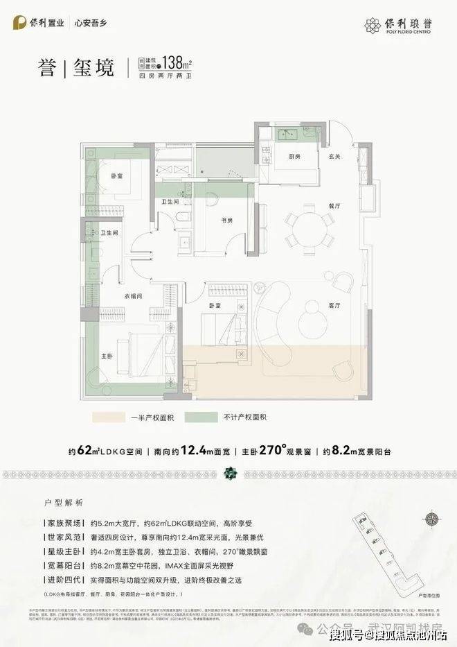 138㎡户型:四房两厅两卫,该户型为四房两卫,三开间朝南,入户玄关,南向面宽约12.4米,约8.2米的南向宽景阳台,完全动静分区设计,有62㎡的动区空间,双卧朝南,主卧为270°观景窗设计。✅武汉【保利琅誉】楼处电话:400-678-8669转接分机号1111【已认证】