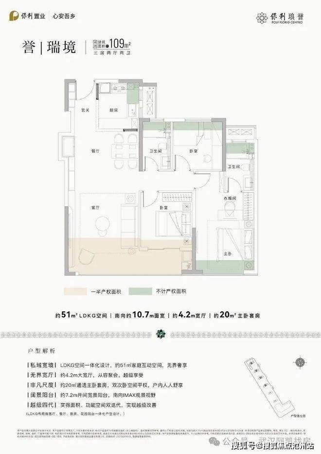 109㎡户型:三房两厅两卫,该户型为三房两卫,三开间朝南,入户玄关收纳空间,南向面宽约10.7米,约7.2米的南向宽景阳台,51㎡的动区空间,约20㎡的主卧套房,还是双卧朝南设计。此外,主卧、次卧、厨房有不少全赠送空间。