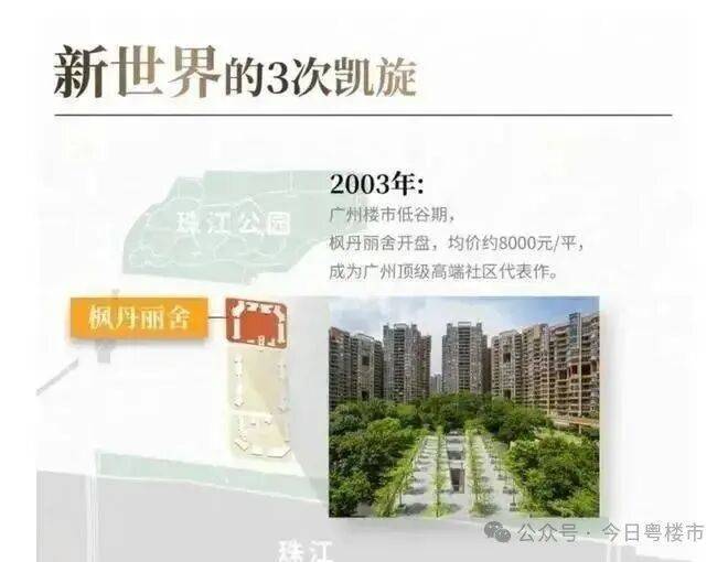 同年,凯旋新世界一期枫丹丽舍开盘,以约8000元/平的均价,成为广州顶级高端社区的代表作。