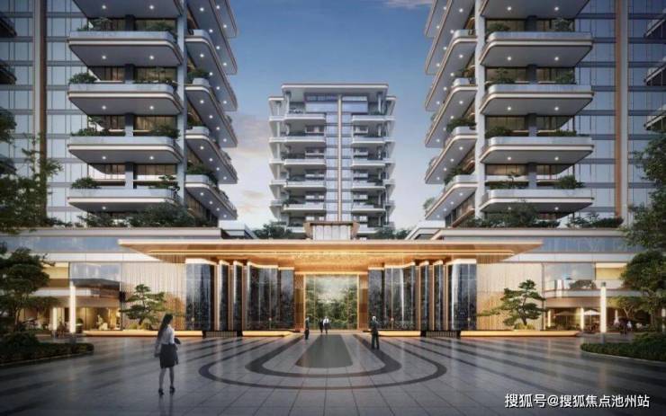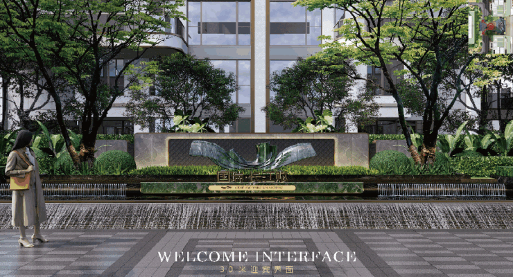 大门约9米恢弘高度与约43米开阔尺度,搭配香槟金星空顶、蓝钻奢石、青松,让归家更显气派。