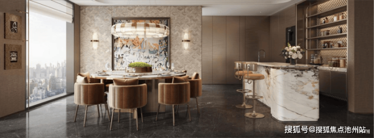 打破客厅与阳台的界限,构建起270°寰幕视野家庭社交中心,餐厨空间通过圆桌与西厨岛台成为家庭烟火与雅趣的交融之所;