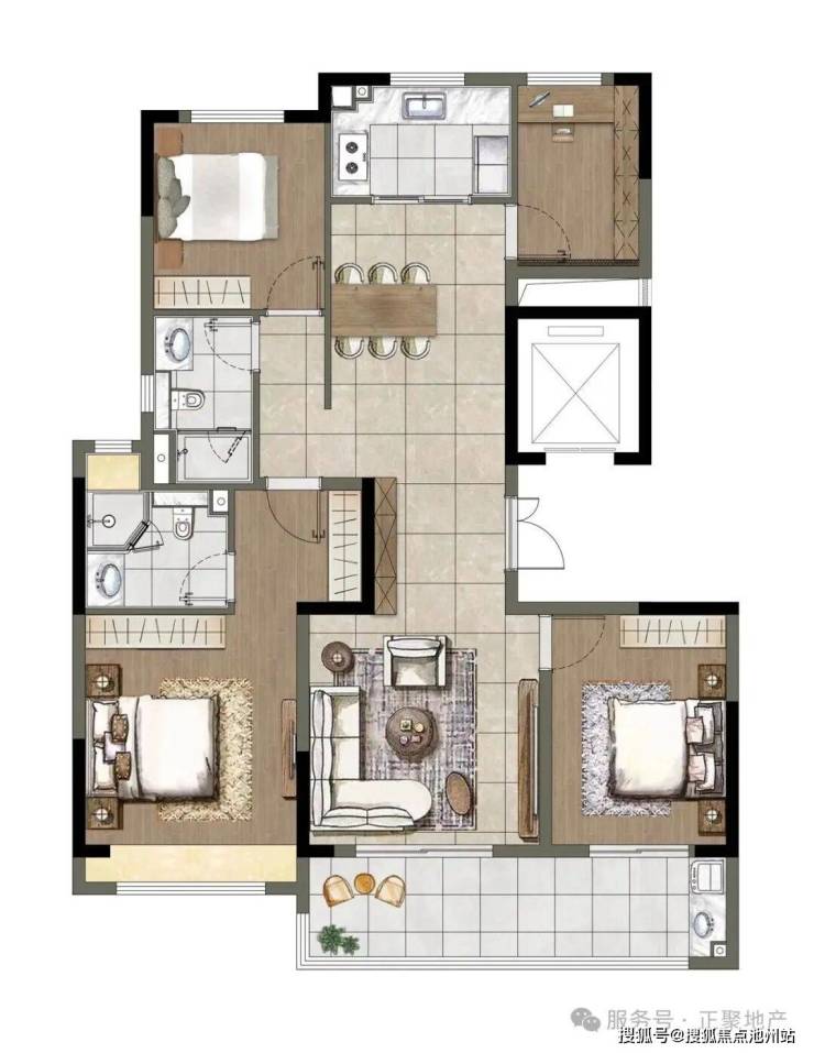 110㎡和115㎡户型三房两卫,功能性很强,全明户型,每个房间都带超大飘窗。卧预留衣橱空间、卫生间,私密性强。