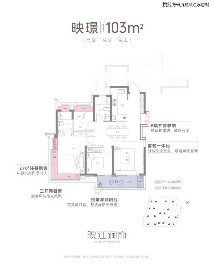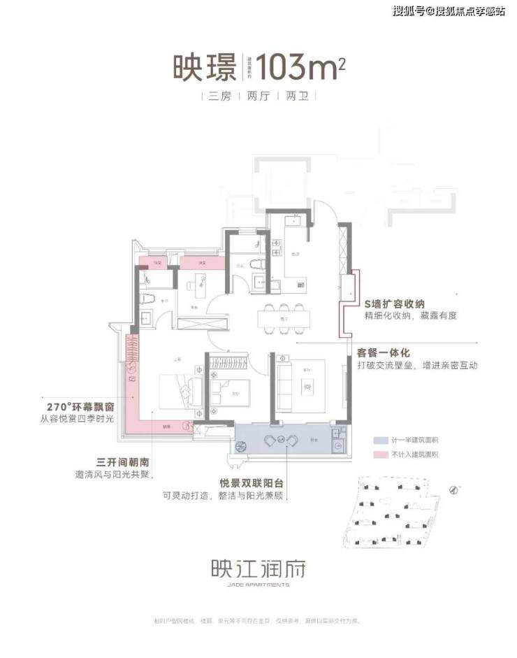 建筑面积约103㎡三房两厅两卫,不失为改善家庭的首选。其中边套户型,映江润府的主卧套房做了 270°环幕飘窗,实现无与伦比的采光通风和视野享受,类比于千万级豪宅的体验!