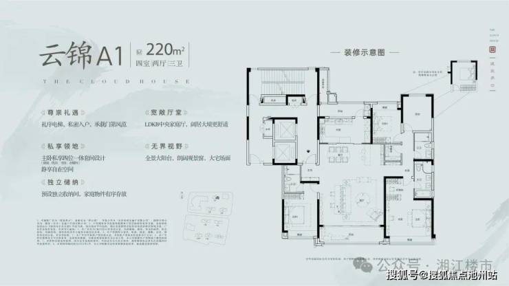 户型方面,从约220㎡四室两厅三卫,到约300㎡五室两厅四卫,每一款都布局合理。约300㎡户型的270°寰宇会客厅,让你俯瞰城市繁华与天地浩瀚。