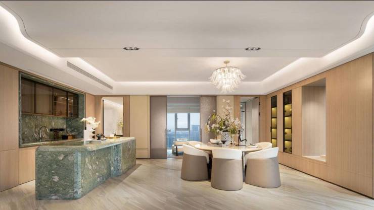 法国木纹石、影木、实木复合木地板及奢侈皮料等,以恰到好处的温度与柔和,为生活洒下一抹静谧。