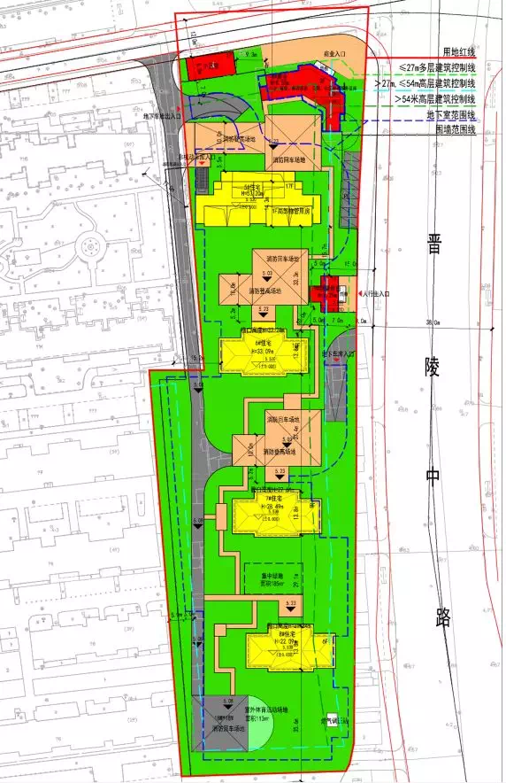 该地块的主要出入口设于晋陵中路上,小区内绿化覆盖多集中在小区最南侧以及7#、8#楼中间。