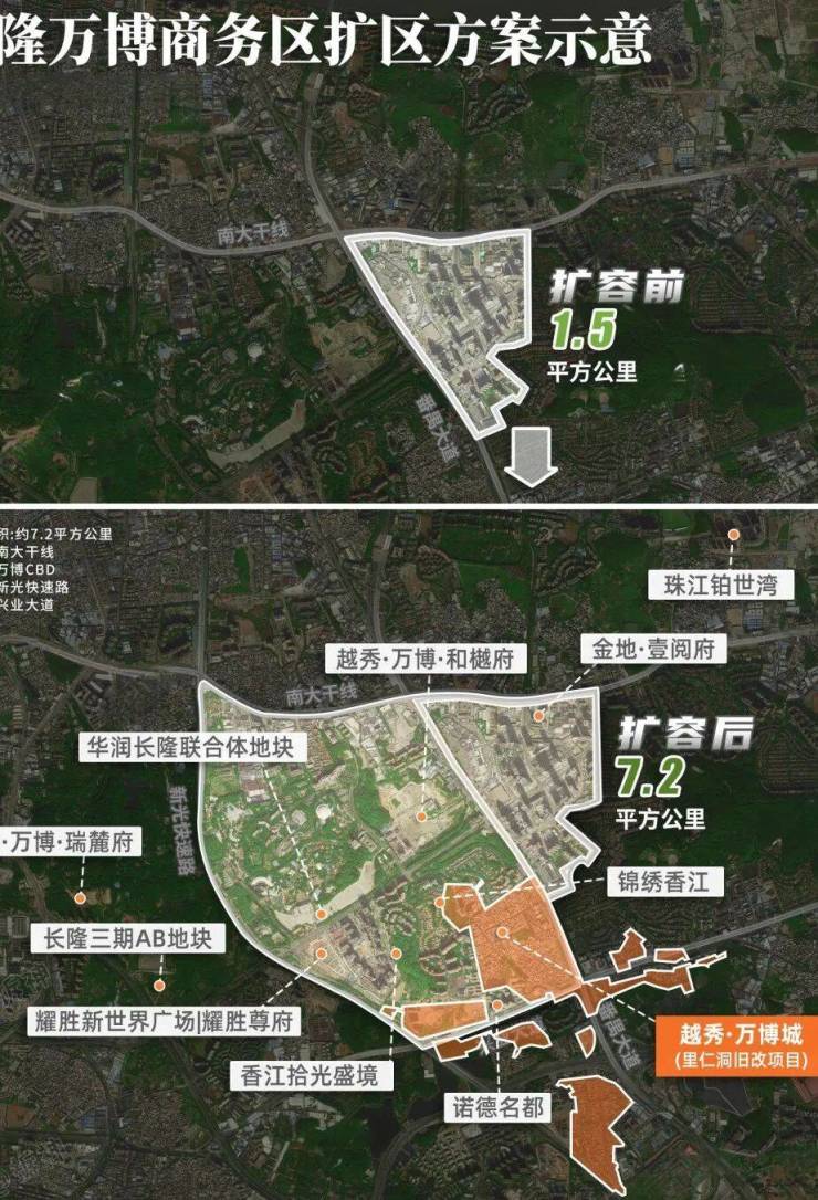 万博、长隆,作为番禺两大经济圈,从前位置离得近,可惜中间隔了个城中村,只能各自为战、无法强强联合。