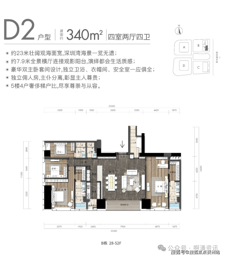 4房户型为340、343平,总价区间为5227 - 7147万/套。东向大户型拥有绝佳视野景观,大开间短进深双面采光,主要生活空间可俯瞰深圳湾海景;餐客厅开间3.9米带有大型观景阳台;三套间双主卧配置,空间宽敞舒适;大型餐厨空间品质上乘,还有独立工人休息间并带有卫浴 。