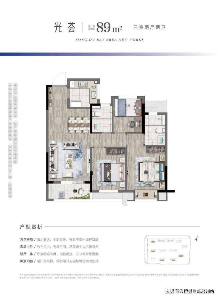 户型打造上,沁悦宸轩更是追求极致,建筑面积约89方户型, 三开间朝南设计, 约9.5米面宽,大面采光,引阳光入室,使空间尺度更加宽敞明亮。