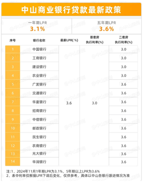 其中,中山四大行首套和二套统一执行标准利率,即3.0%(LPR-60BP)!