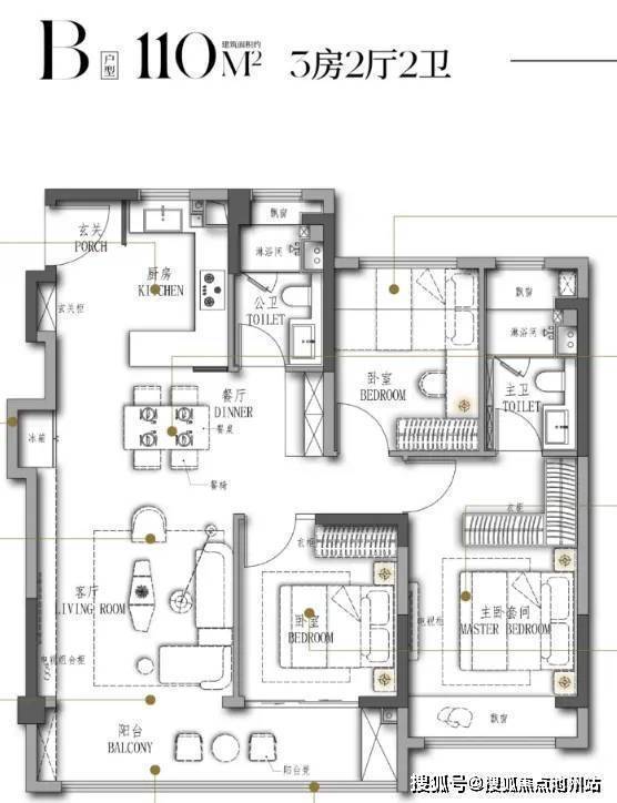 建面约110㎡的3房2厅2卫: