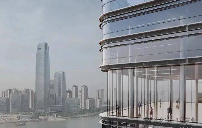 外立面采用木色陶板与全景玻璃幕墙,以“曲水流觞”的涟漪造型呼应珠江文脉,同时融入垂直生态理念,打造空中绿岛与可呼吸的建筑肌理。