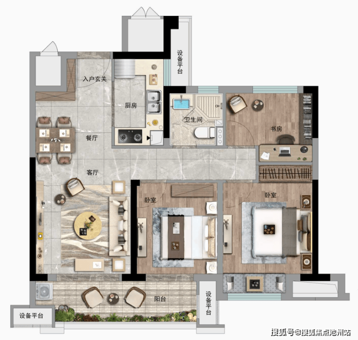 当然,还有更极致的建面约75㎡户型,两居。