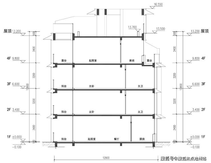我以前一直不建议买叠拼,原因就是开间太小,但现在的叠拼基本解决了这个问题。这次姚江润园的叠拼,开间来到了约11.5米,客厅开间约7.7米。包括他的层高,也比以往的叠拼要高,下叠首层层高约3.4米,二层约3.2米。上叠因为做了倒置处理,所以是二层约3.4米,一层约3.2米(下图)。这个自己理解一下,是现在很流行的做法,避免了业主去顶楼露台还需要经过卧室区的问题。所以说,现代叠拼的空间尺度感是拉满的,完全配得上“墅”的说法。