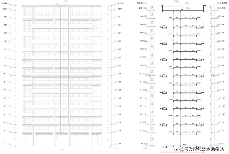 接下来就是高层,一共8幢,分别是14-20层,都是两梯两户,带有四代宅标志性的空中花园,并且运用了奇偶错层出挑的设计。从效果图来看,应该是偶数层南向露台,奇数层东西向露台,而且北向好像还有露台!因为单层层高约3.15米(下图),那么在错层设计之下,空中庭院就拥有了两层层高,挑高达到约6.3米。而且高层全部架空,架空层层高也有约5.1米,至少从基础数据上来看,符合当下豪宅标准了!