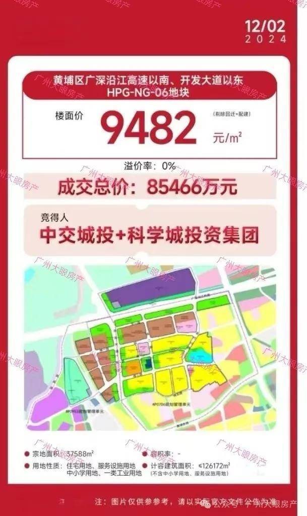 2024年12月02日,黄埔区广深沿江高速以南、开发大道以东HPG-NG-06地块被中交城投联合广州峻森投资有限公司以底价85466万元拿下,折合楼面价9482元/㎡。