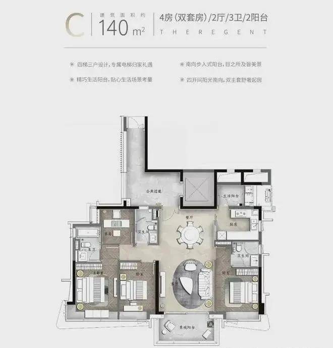 产品亮点:私家电梯入户、约3.4米层高、动静分区南北对流、约6.8米挑空餐客厅、中西双厨、三套房设计、部分房间带阳台设计