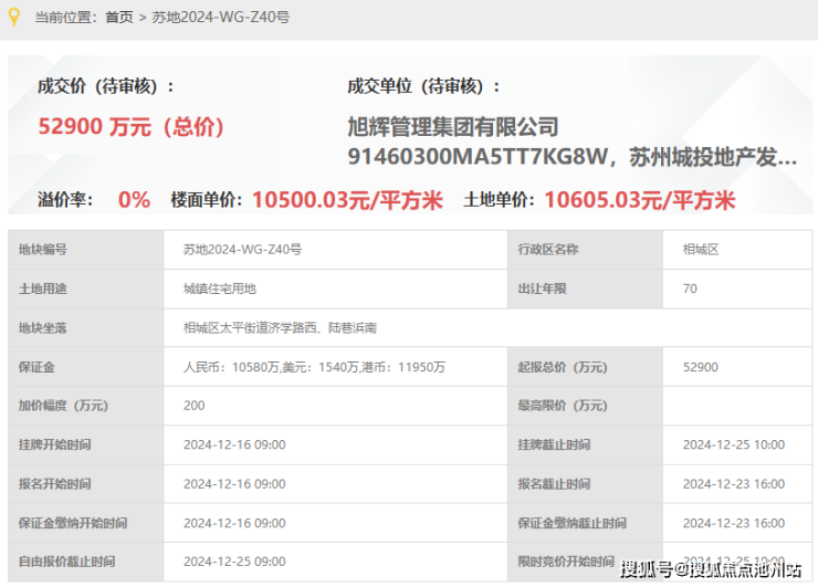旭辉&城投&太平40号地块项目,即,苏地2024-WG-Z40号,位于相城区太平街道济学路西、陆巷浜南,是2024年12月25日,城投地产&旭辉&太平城乡一体化以底价52900万元竞得,成交楼面价10500元/平。