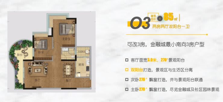 🅣🅞🅟03户型【85㎡2房1卫】南向园林景观