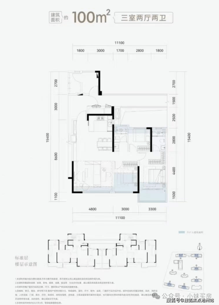 做的是三房两卫格局,功能性很强;中间户,北面为连廊,户型格局还比较方正;除开传统的飘窗之外,南向两个卧室有大面积的赠送;整个户型的尺度做得也很阔绰,客厅部分开间约4.8米,大横厅有了,整个南向开间11.1米,这在100平户型里面相当优秀。