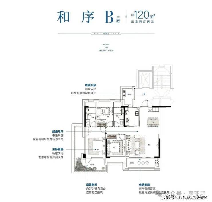 三开间朝南,约13.1m全明宽境,客餐厅一体化布局;