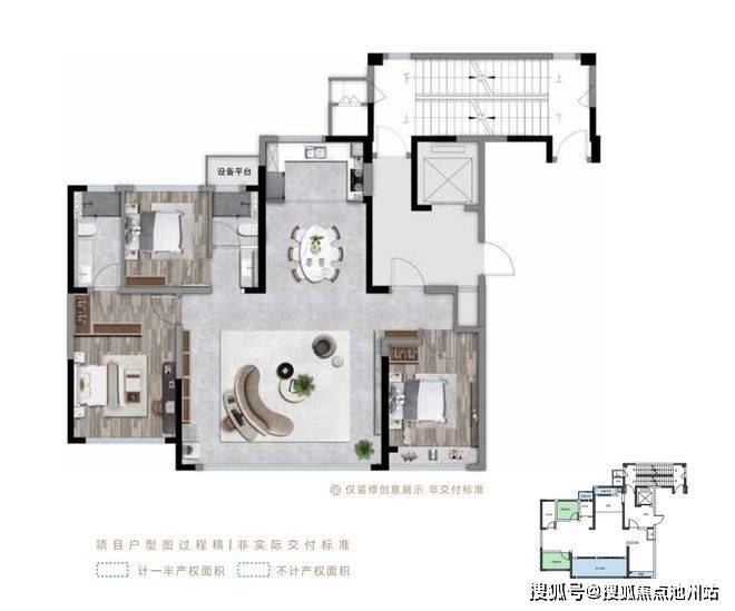 建筑面积约128㎡样板间示意图,仅作为装修创意展示,非交付标准,本项目为毛坯交付。如业主需进行结构优化的,需交付后自行向政府部门进行装修备案,存在无法审核通过的风险,开发商在此不做承诺;如通过装修备案的,后续结构优化施工费用由业主自理。