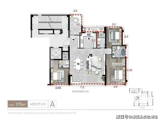 该户型建面约170㎡,南向面宽约14.75米,客厅开间约7米左右,空间尺度非常阔绰,居住体验可想而知,只可惜其“大面积、高总价”的门槛,却是让许多改善家庭渴望而不可及。