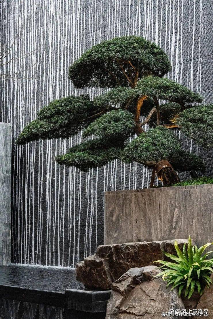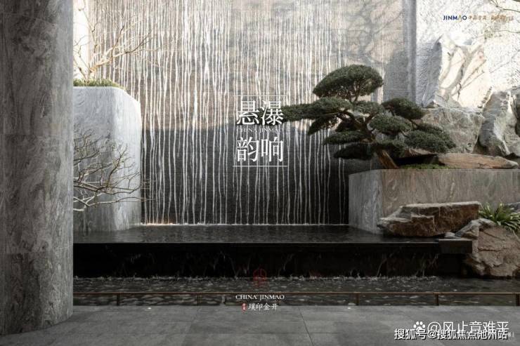 绕过透光云石玻璃照壁,又换了一层质地:地面至墙体都被石材包裹,青松探身,飞瀑自石壁上跌落,现代文明与自然在此交融碰撞。