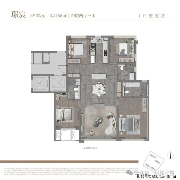 建面约155平,四房两厅三卫: