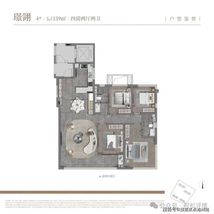 该户型为2、4号楼端头边户,南北通透,三开间朝南,结构相对常规。带独立电梯前室,且电梯前室还做了一道门进行隔离。建面约139平可以做四房,功能性比较强。亮点是主卧全景舱两面拐角飘窗,优化面积多,采光比较好,不过床就不太好摆了,得对着主卧门口。