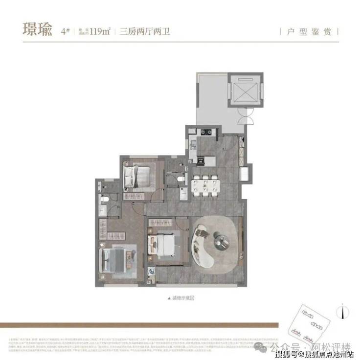 该户型带独立电梯前室,两个卧室能做到270° 景观视野,大概率也是双面飘窗。不过,南向次卧卫生间是暗房,南向次卧外有空调机位,按照户型图显示会一定程度遮挡采光(实际情况待定),餐厅位于户型中部,采光较弱。