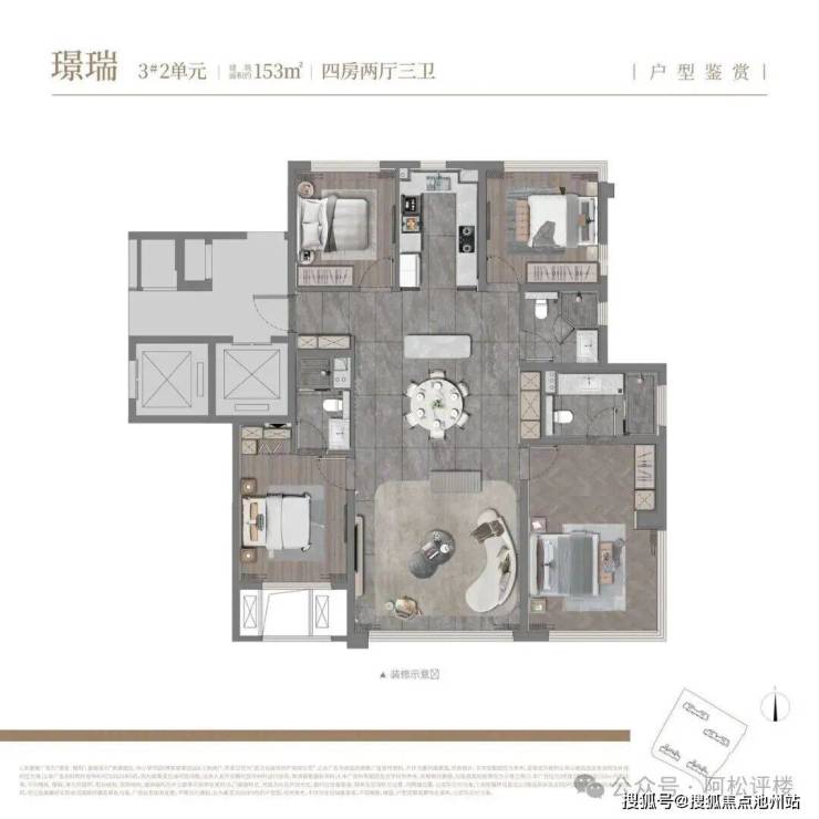 建面约153平,四房两厅三卫: