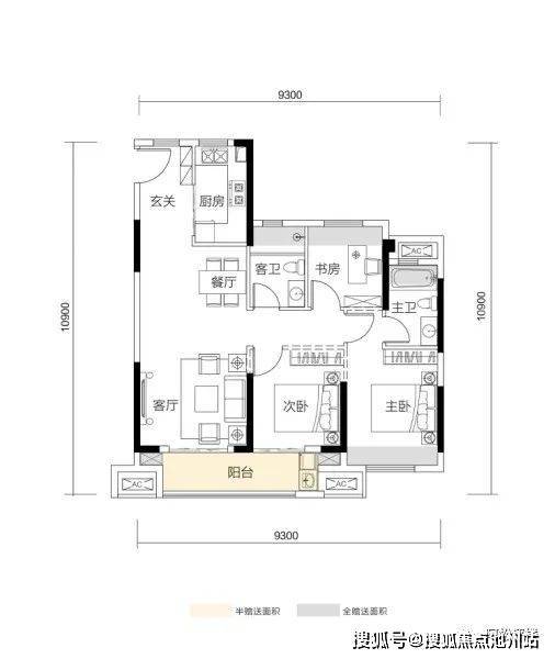 2号楼两个单元连接处边户,户型结构与上面建面约89㎡户型基本一致,不过这个户型北侧没有连廊,是正南北通透的。