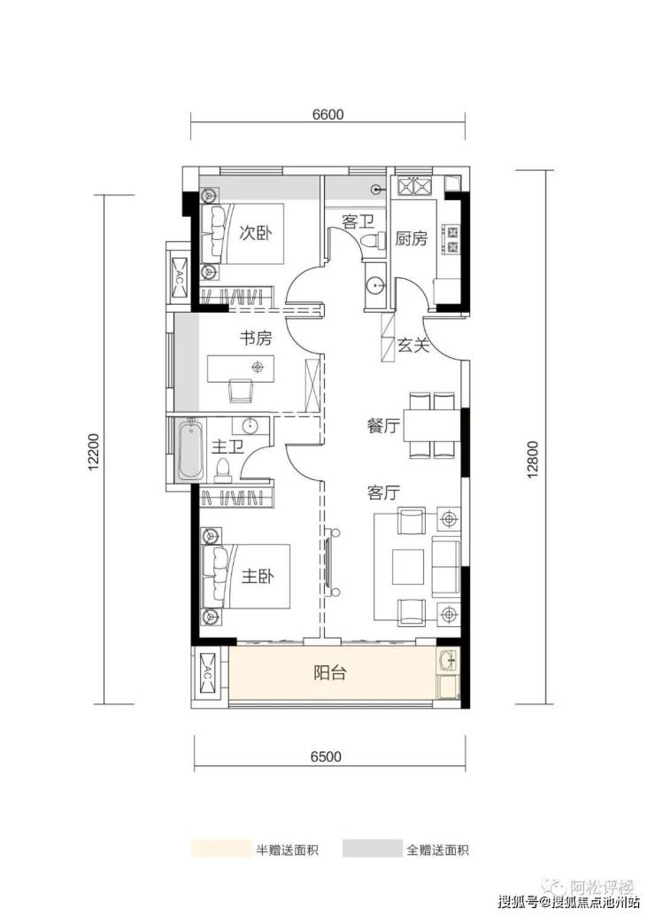 1、2号楼中间户,户型方正,三开间朝南,南向超大阳台连通一间卧室,动静分区,北侧对着连廊,依靠连廊实现通透性,但北侧房的采光和私密性较差,主卧带独立卫生间。