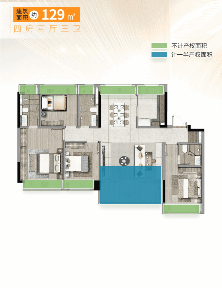 以建面约129㎡的大四房为例,巧妙的空间设计,将每一寸面积都充分利用,几乎零浪费,实现100%使用率。