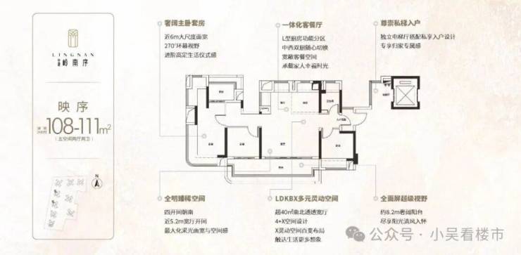首推5-6栋建面108-141平方米户型。108平方米户型通过“四叶草”动线优化,实现五房布局;
