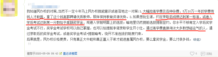 有的网友则认为“上有政策,下有对策”,民办名校依然可以通过入学收费抬高入学门槛,或者通过约定高额奖学金让想碰运气而并无实力的学生知难而退,变相实现“掐尖”的目的。这样一来,可能就治标不治本了。