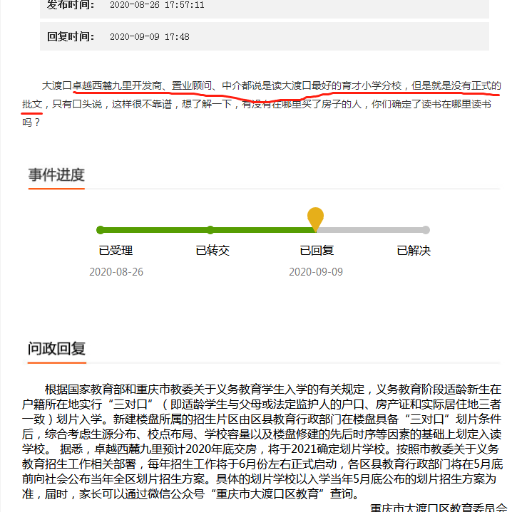 《重庆某楼盘消失的学校,最终逼得业主维权!》一文中,业主反映在2017年购买的磁器口某楼盘的房子,当时开发商承诺的教育配套有有沙小和7中分校,当时开发商拍胸脯保证了19年一定会有学校供孩子们入读。然而一直到2020年学校才正式动工。