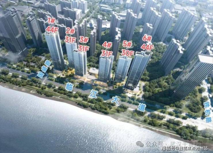 2.项目规划6栋住宅,4栋30-31层高层 + 2栋44层超高层,全部东南-西北朝向,一字错位排布确保每栋无遮挡观江.