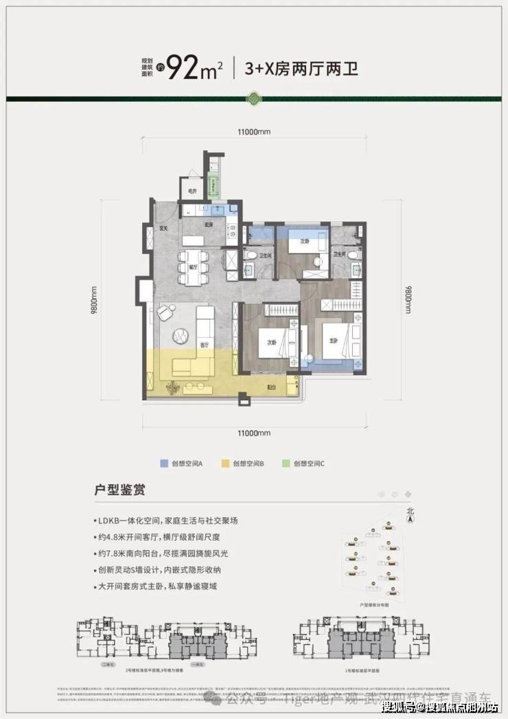 92平三房两卫,约4.8米的大横厅,7.8米的南向阳台,在100平以内能有如此大尺度,堪称刚需王者。