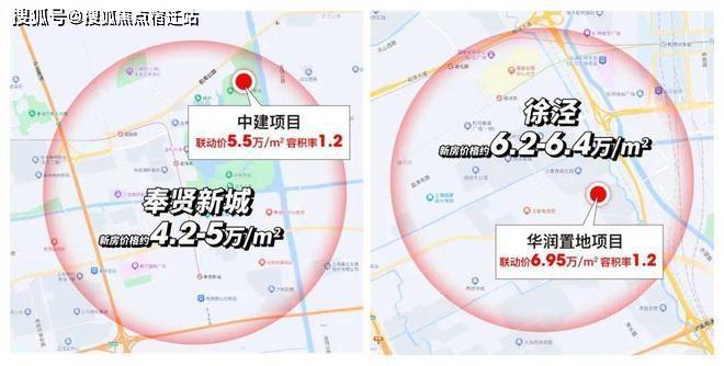 比如徐泾板块新房均价普遍在6.2-6.4万/㎡,而容积率1.2的华润项目就是能达到6.95万/㎡。再比如奉贤新城均价普遍在4.2-5万/㎡,而容积率1.2的中建项目联动价高达约5.5万/㎡。