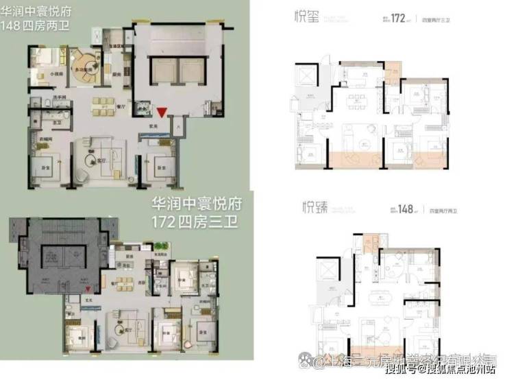 共5栋住宅,首开1、2、5号楼,建面约148-172㎡带装修改善户型,带装修交付,准四代住宅。1、2号楼建面约148平优化后得房率93%,5号楼建面约172平优化后得房率95%,均为两梯两户带装修。华润中寰悦府全部为高层,其中1、2、4号楼均为33层,5号楼32层,均为一个单元,3号楼两个单元,分别是22层和25层。所有楼栋均为两梯两户布局,主打面积148、172平。