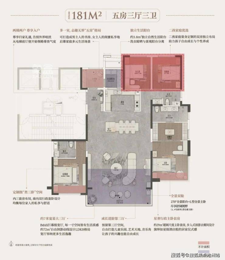 长沙润府历时一年重磅打造建面约181㎡央景宽幕大平层,在整个大盘的3000多户里,本次加推的建面约181㎡户型配比不到1/20,对比市面同等面积段的产品,能做到五房三厅、南向58米楼距、全景阳台\主卧、二孩平权房、志趣第五房等诸多创新设计,可谓全市罕有。