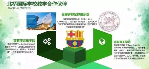 北桥国际学校的艺术类课程是与茱莉亚音乐学院合作、体育类课程是与巴塞罗那足球俱乐部合作、科学类课程是与麻省理工学院合作,教学质量极高。