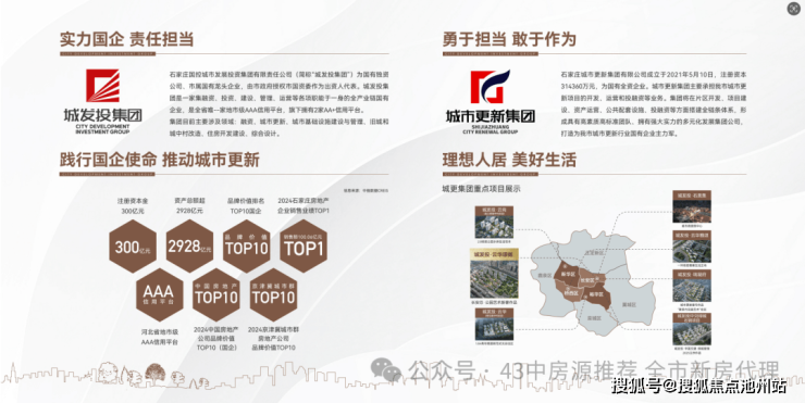 城发投集团作为国有独资的市属龙头企业,总资产近2680亿元,是石家庄规模最大、全省唯一的地市级AAA信用平台,荣获“2023中国房地产公司品牌价值TOP10(国企)”等多项荣誉。