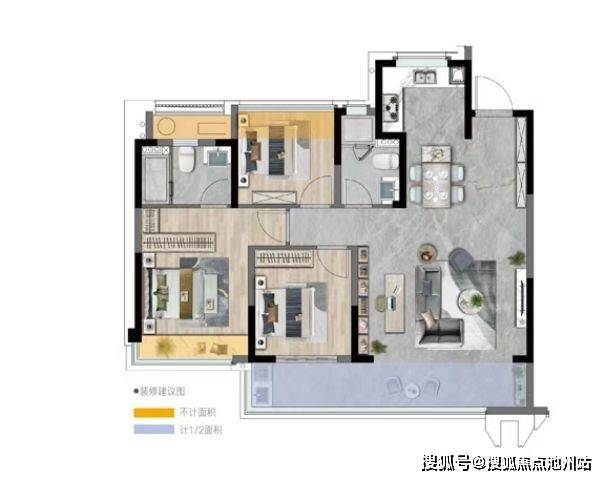 对比市面上常见的同面积段产品,云潮中心建面约113南厅户型足足多出0.5-1个开间,拥有约11.4米南向大面宽以及约8.1米双联阳台。