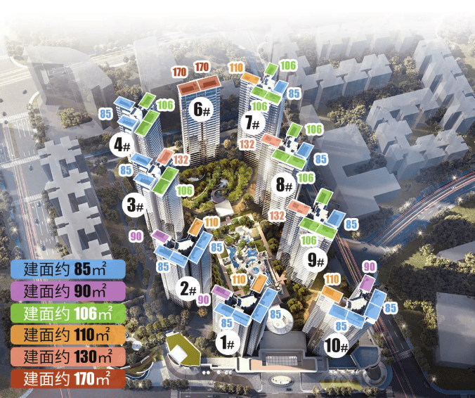 3.楼体形态为塔楼+板楼,板楼作为楼王。将会打造9栋住宅,采用塔楼为主+板楼结合的模式。其中,1栋、2栋和10栋为一层六户,5栋、3栋和7-9栋为一层五户,6栋为板楼设计。