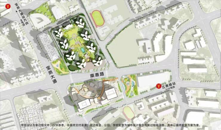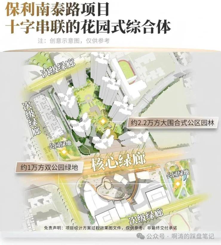 这条十字中轴沿着南泰路两侧展开,把地块南北两侧、住宅区内部的集中绿地串联,构建出约3.2万方社区内大花园 + 外部双公园结构;