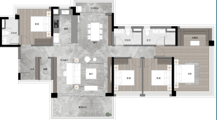 建面约123平四房,卧室都可放下1.8米大床,体验感相当于144平大宅,品质感更高。